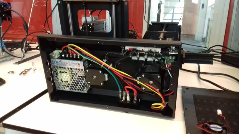 Nu kan je alle elektronica van deze 3D-printer bekijken en controleren op loszittende stekkertjes. (Er leek niets aan de hand te zijn voordat we hem gingen demonteren. Maar als je er toch heel makkelijk bij kan.)